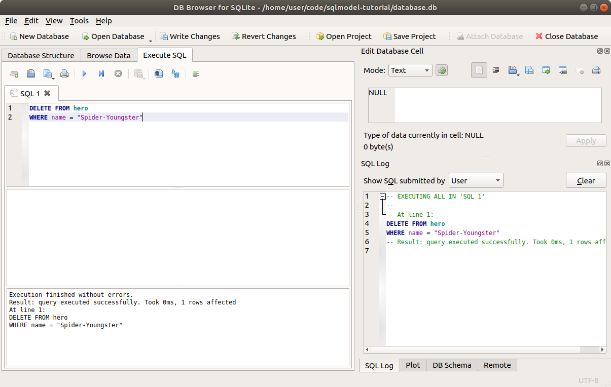 INFO Engine BEGIN (implicit) INFO Engine SELECT hero.id, hero.name, hero.secret_name, hero.age FROM hero WHERE hero.name = ? INFO Engine [no key 0.00011s] ('Spider-Youngster',) -